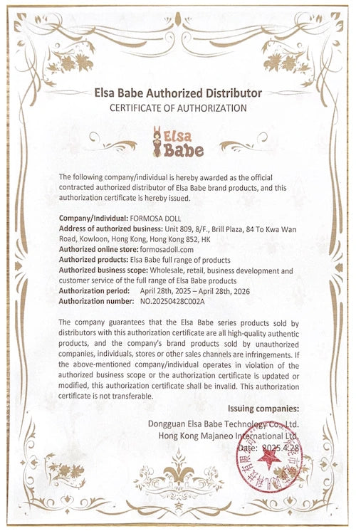 Formosa Doll is an authorised retailer — you’ll find the official certificate from the manufacturer displayed on the bottom of the product page and in our Official Distributor Certificates section.